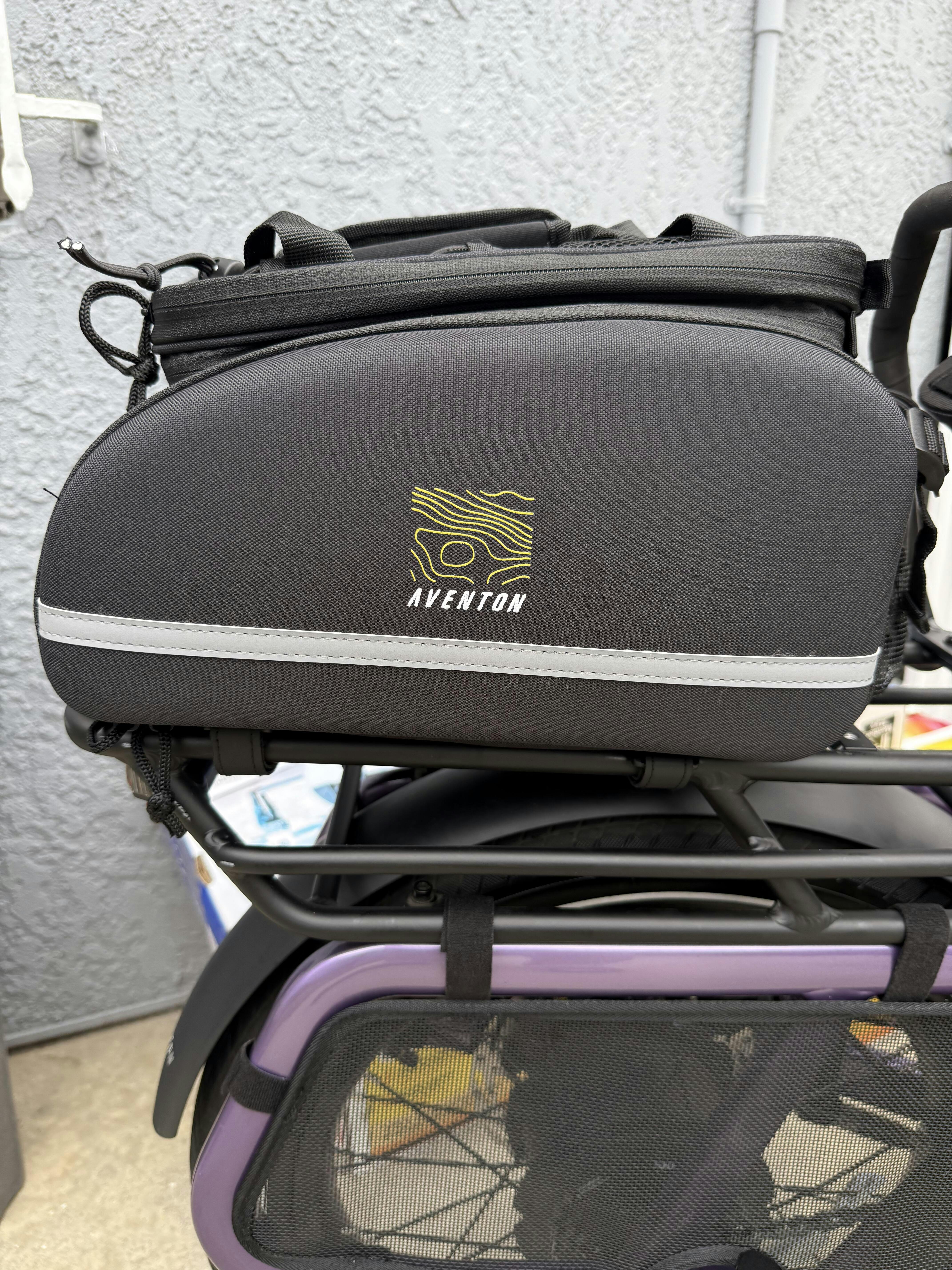 The Aventon Rack Top Bag is the ultimate accessory for your commute. This bag features a spacious main compartment that is conveniently divided for safe & easy organization. The Rack Top Bag also expands into two expandable pannier side panels, allowing you to carry even more essentials on your ride. It's built to withstand the demands of your active lifestyle, ensuring that your belongings stay safe and secure throughout your journey on the road.